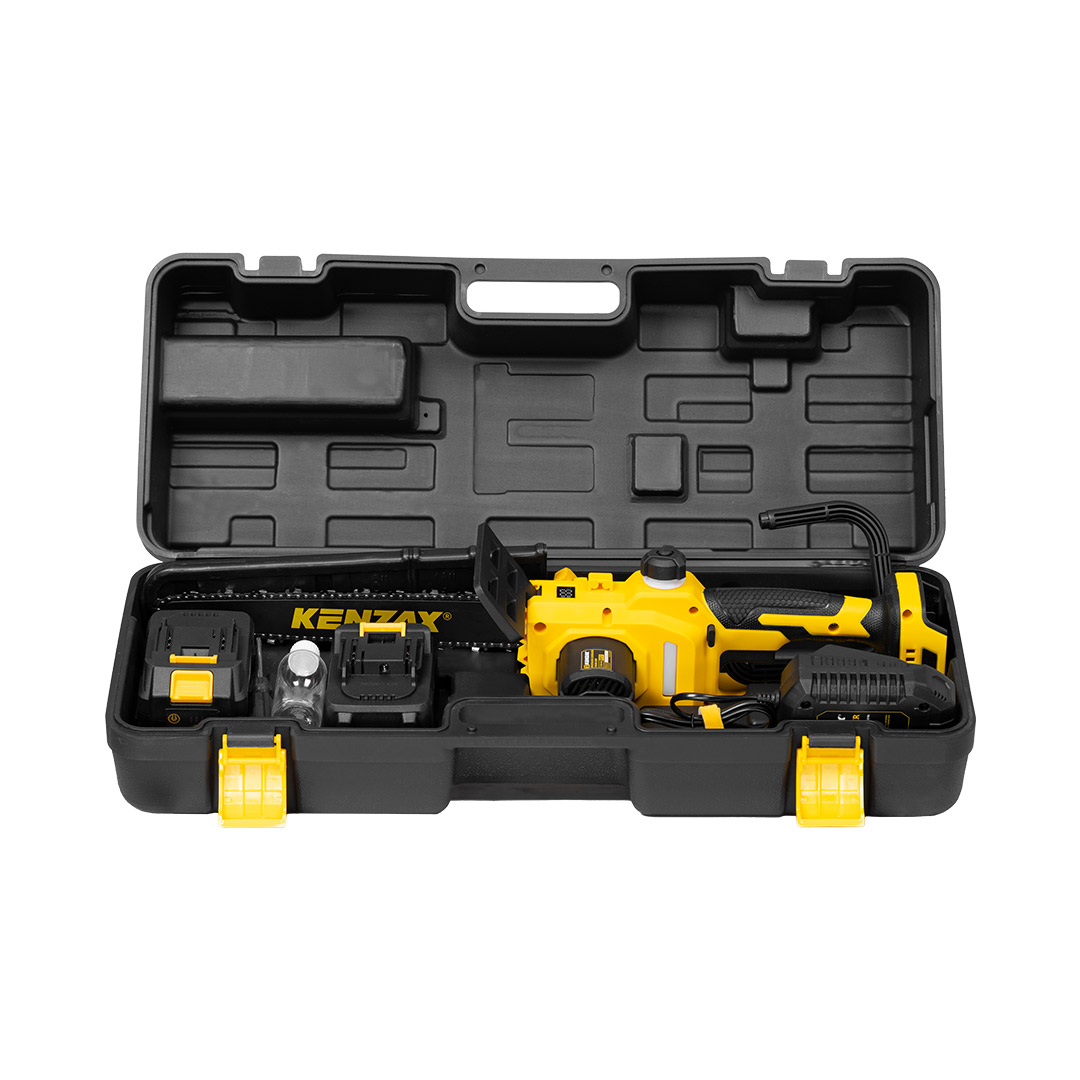 اره زنجیری شارژی, اره براشلس کنزاکس, اره زنجیری 8737, اره شارژی 30 سانت, اره شارژی 20 ولت, خرید اره زنجیری کنزاکس, ابزار باغبانی شارژی, اره زنجیری دو باتری, اره شارژی حرفهای, اره زنجیری لیتیومی, ابزار سپهر, KENZAX Chainsaw, اره زنجیری PRO